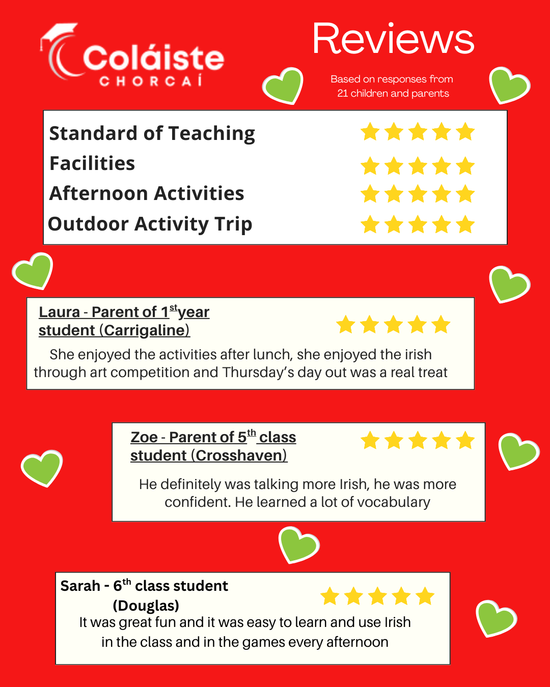 Our Skilled Team of Múinteoirí and Cinnirí guarantees a fulfilling week of lessons, games, sports, dance, music, and art while learning Gaeilge through fun. See feedback from Parents and Students.