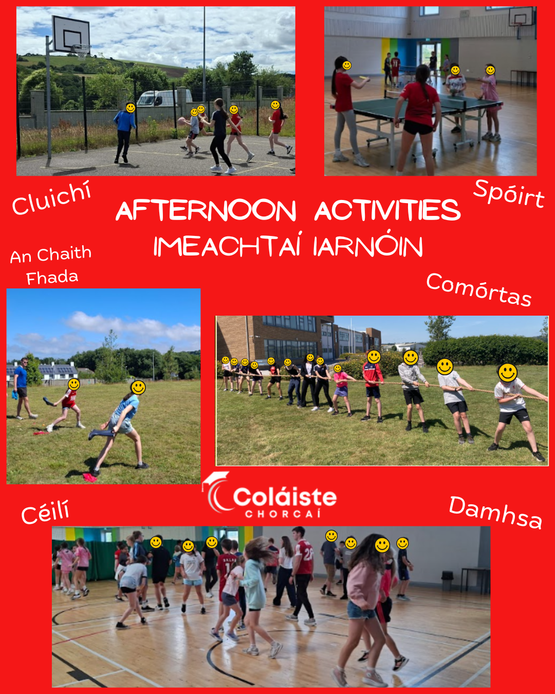Afternoon games will take place both indoors and outdoors. Activities are all conducted through Gaeilge and include board games, football, basketball, rounders, volleyball, badminton, and many more. The emphasis on all activities is fun while using Gaeilge in a natural way. This provides students with wonderful opportunities to practice and build fluency while engaging in enjoyable and healthy activities.